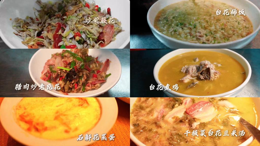 走进西盟县勐梭镇的农家小院,一阵阵花香与食物香中,人们正忙着制作一桌丰盛的“鲜花宴”。炒紫藤花、白花稀饭、腊肉炒老瓦花、白花煮鸡、油炸白花、石斛花蒸蛋、干板菜白花豆米汤……一道道以鲜花为主要食材的菜肴色香味俱全,令人垂涎欲滴。