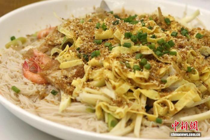海鲜寿面饭,则是一道传统主食。在洞头,谁家喜结良缘、家里添丁,都少不了这一碗“面线饭”带来的美味和美好寓意。洞头之所以称之为“饭”,正是因为没有汤水。面线干拌时,会加入鳗鱼干、墨鱼饼、蛏子、虾干等当地海鲜佐料。